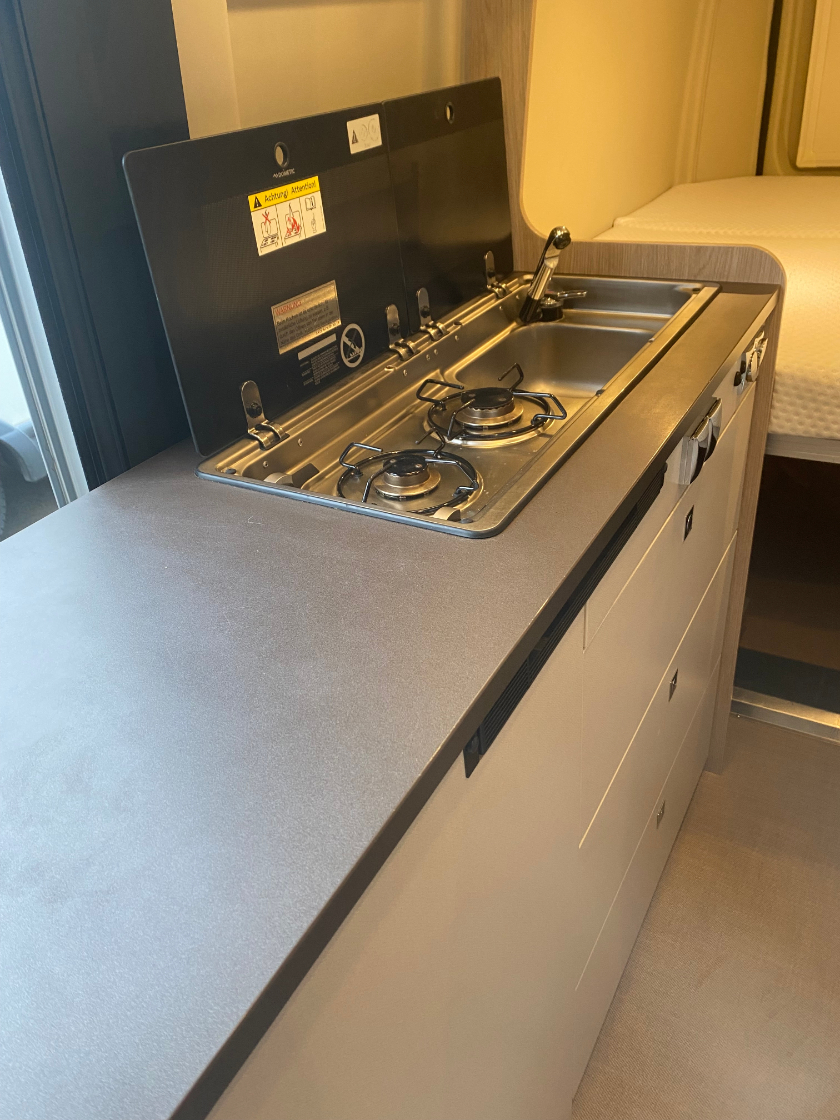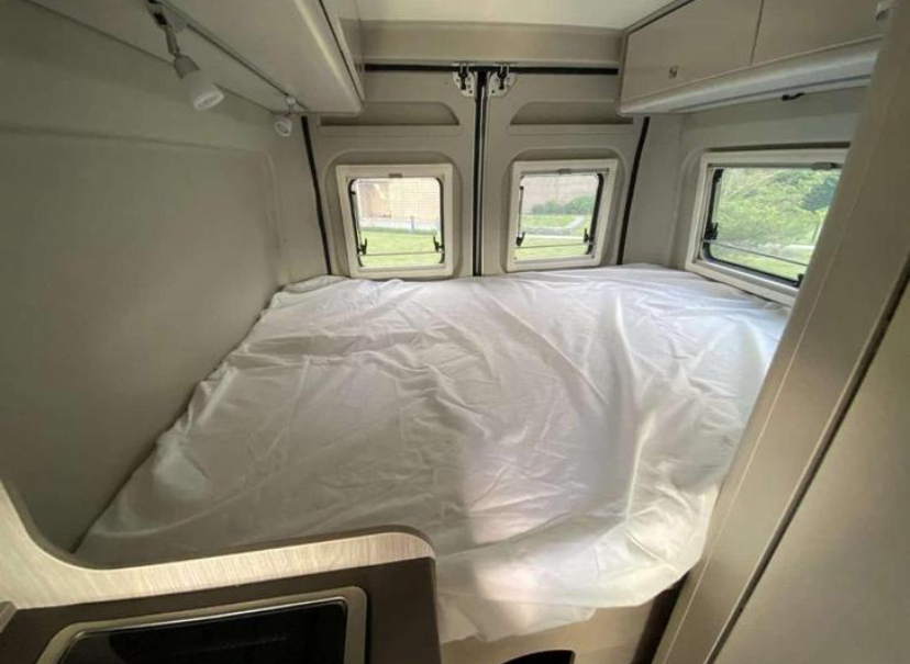 Van de 2021 full équipé avec climatisation (pendant la conduite), frigo, 2 becs à gaz, évier, SDD avec toilette, lavabo et douche), 2 grands lits (200X140 et 200X150) dont un dans le toit relevable.