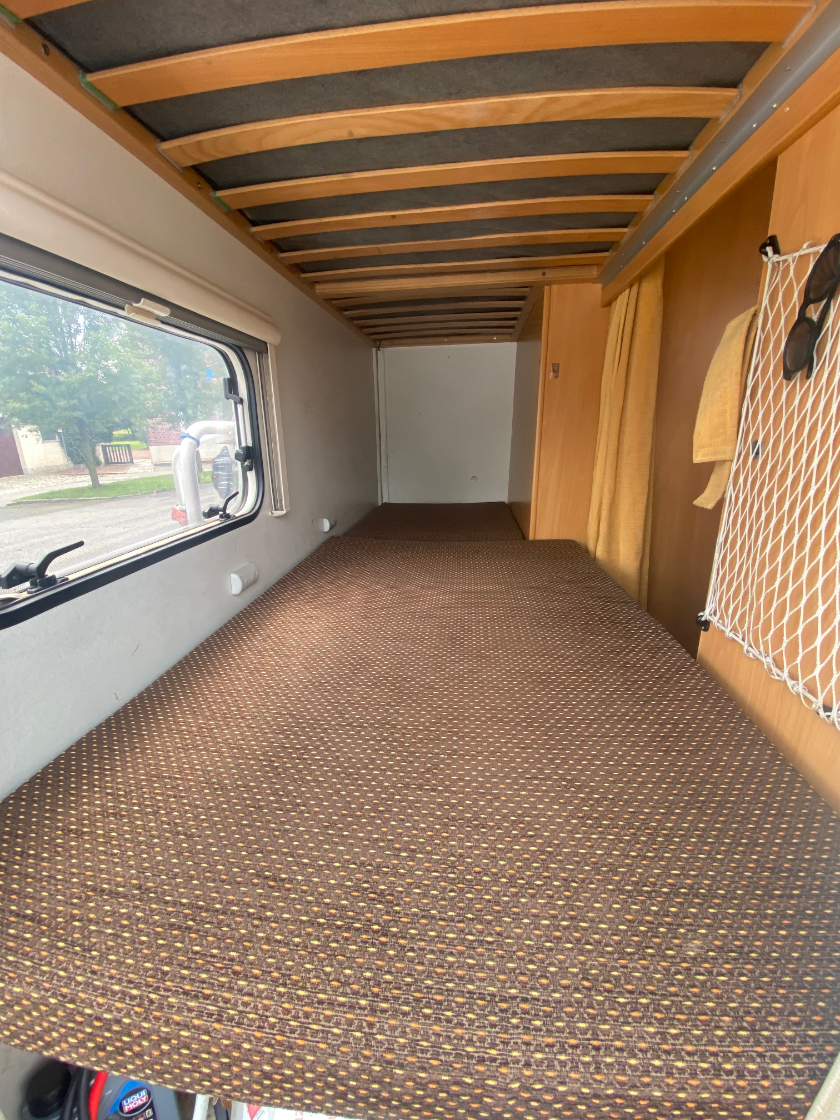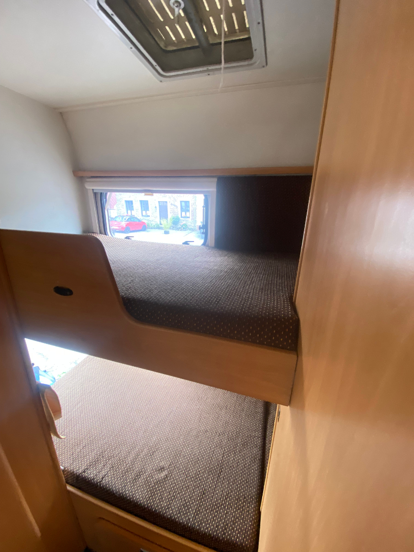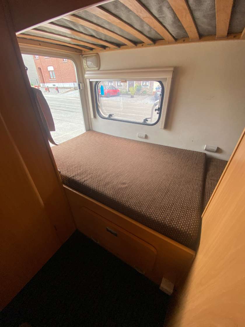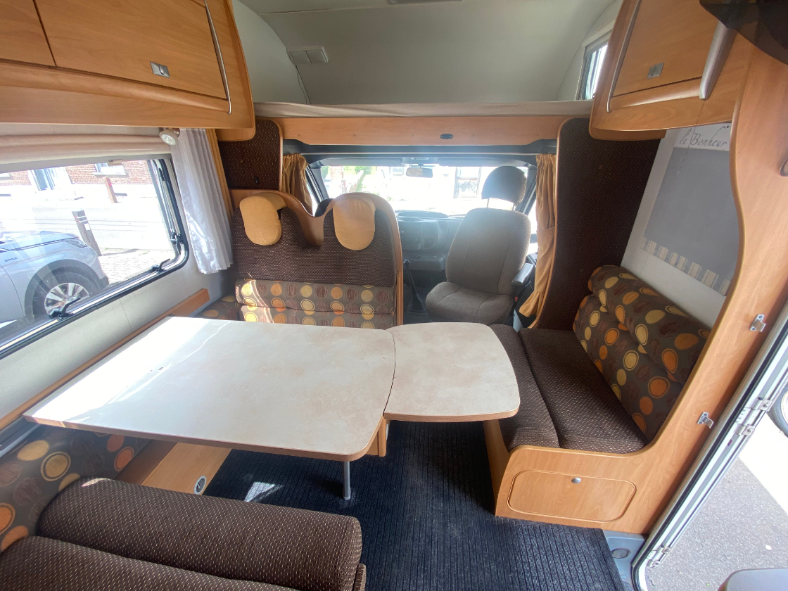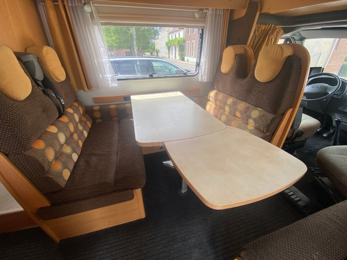 Camping car de 2006 un peu vintage. Homologué pour voyager à 6 personnes (6 ceintures) un lit double en capucine 2 lits à l’arrière superposés lit double au niveau du carré repas (personnes de moins de 170cm - idéal pour enfants plus petits) coin cuisine avec 3 becs au gaz, frigo et évier. SDD avec lavabo, douche et wc (boiler d’eau chaude au gaz) chauffage, camera de recul, porte-vélos (2 vélos, possibilité de mettre un porte vélos (4) - sur demande), boule remorque .