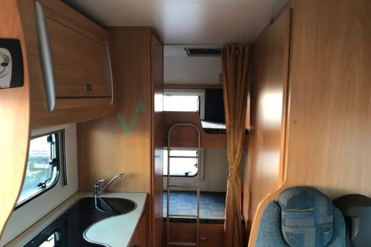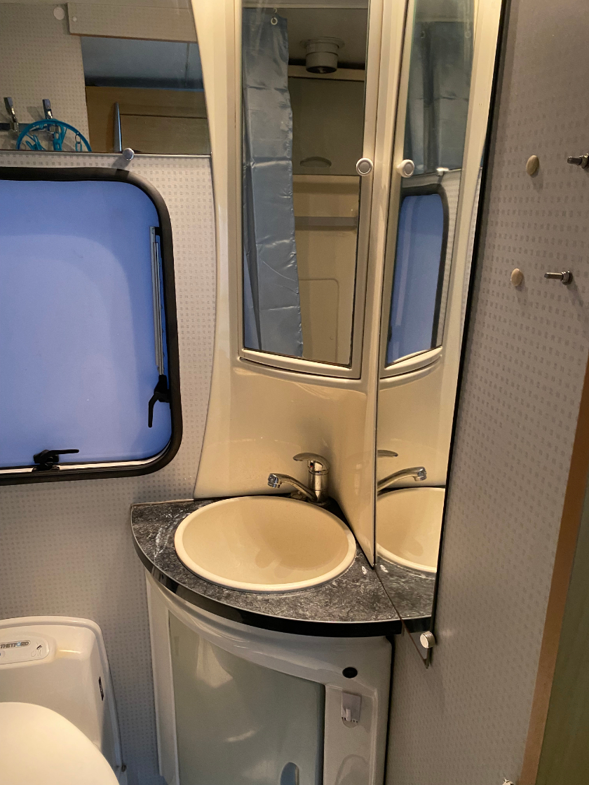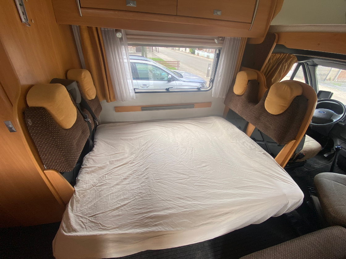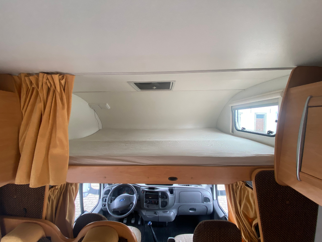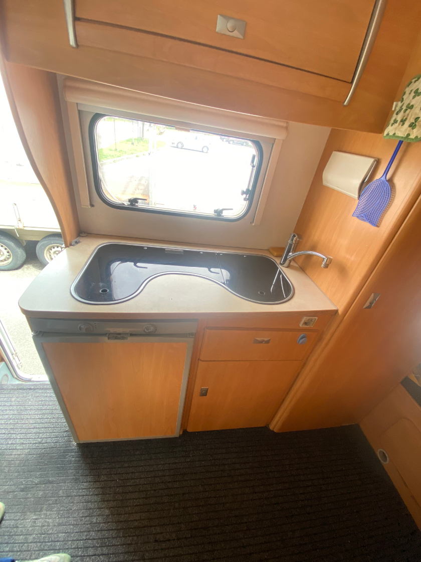 Camping car de 2006 un peu vintage. Homologué pour voyager à 6 personnes (6 ceintures) un lit double en capucine 2 lits à l’arrière superposés lit double au niveau du carré repas (personnes de moins de 170cm - idéal pour enfants plus petits) coin cuisine avec 3 becs au gaz, frigo et évier. SDD avec lavabo, douche et wc (boiler d’eau chaude au gaz) chauffage, camera de recul, porte-vélos (2 vélos, possibilité de mettre un porte vélos (4) - sur demande), boule remorque .